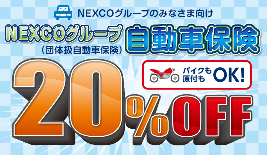 このWebサイトは、NEXCO保険サービスが取扱う引受保険会社の各種商品の概要をご紹介したものです。引受保険会社により取扱商品、補償(保障)内容、引受条件等が異なりますので、ご契約にあたっては、必ず引受保険会社の商品パンフレットおよび「重要事項説明書」「契約概要」等をよくお読みください。ご不明な点がある場合には、NEXCO保険サービスまでお問い合わせください。