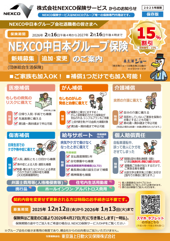 WEBでのお申込みは1月13日(火)をもって終了しておりますので、ご加入を希望のお客さまにつきましてはNEXCO保険サービスまでお問い合わせください。